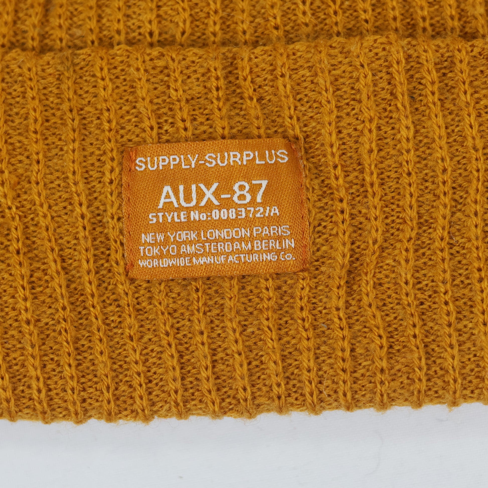 Design: Features an orange woven patch on the front reading "SUPPLY-SURPLUS AUX-87 STYLE No:000372/A" listing major cities like New York, London, and Tokyo