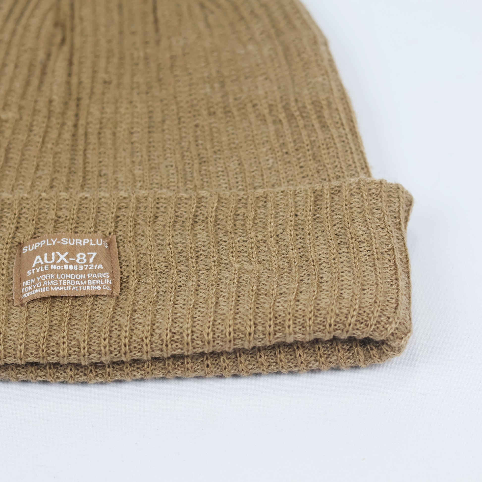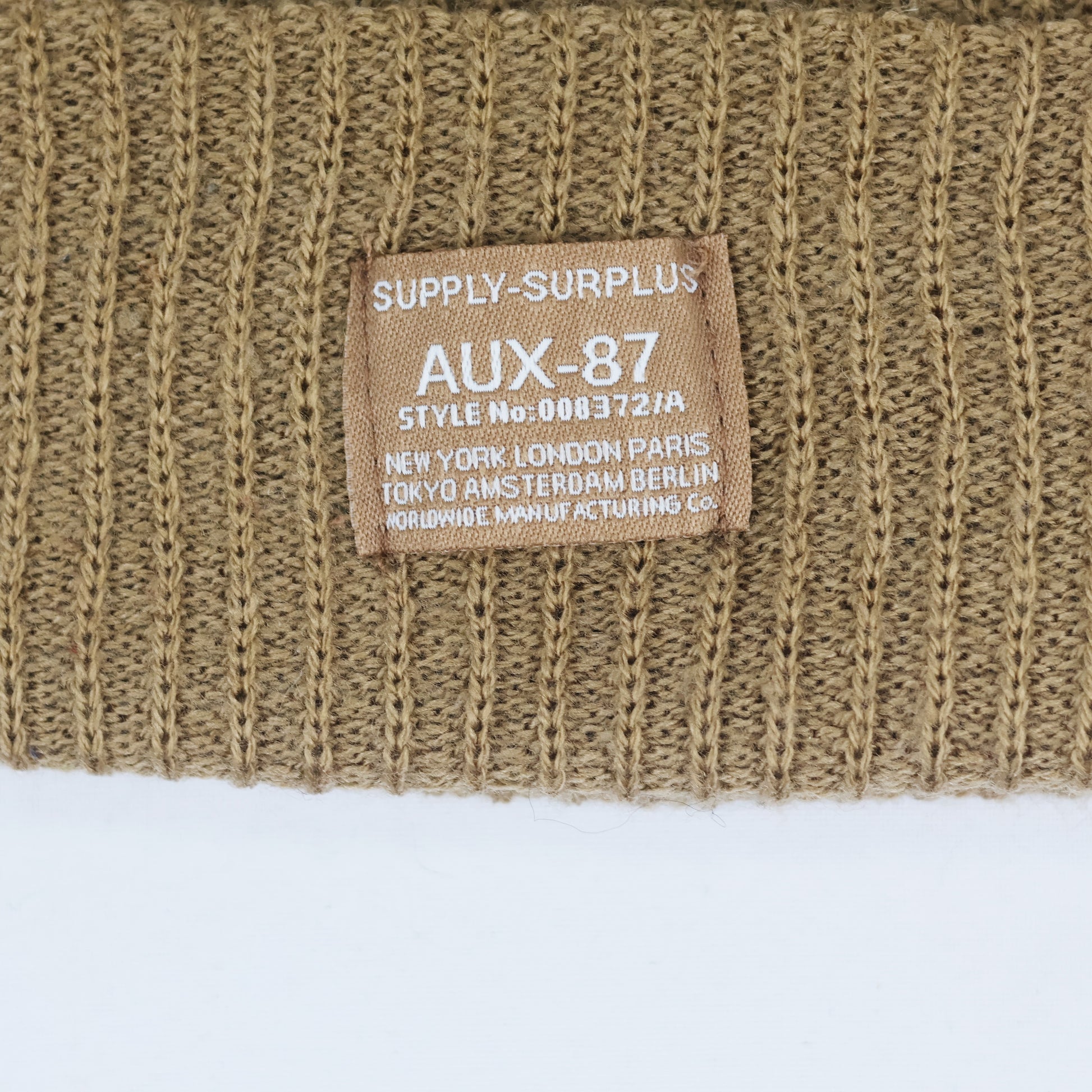 Design: Features an orange woven patch on the front reading "SUPPLY-SURPLUS AUX-87 STYLE No:000372/A" listing major cities like New York, London, and Tokyo