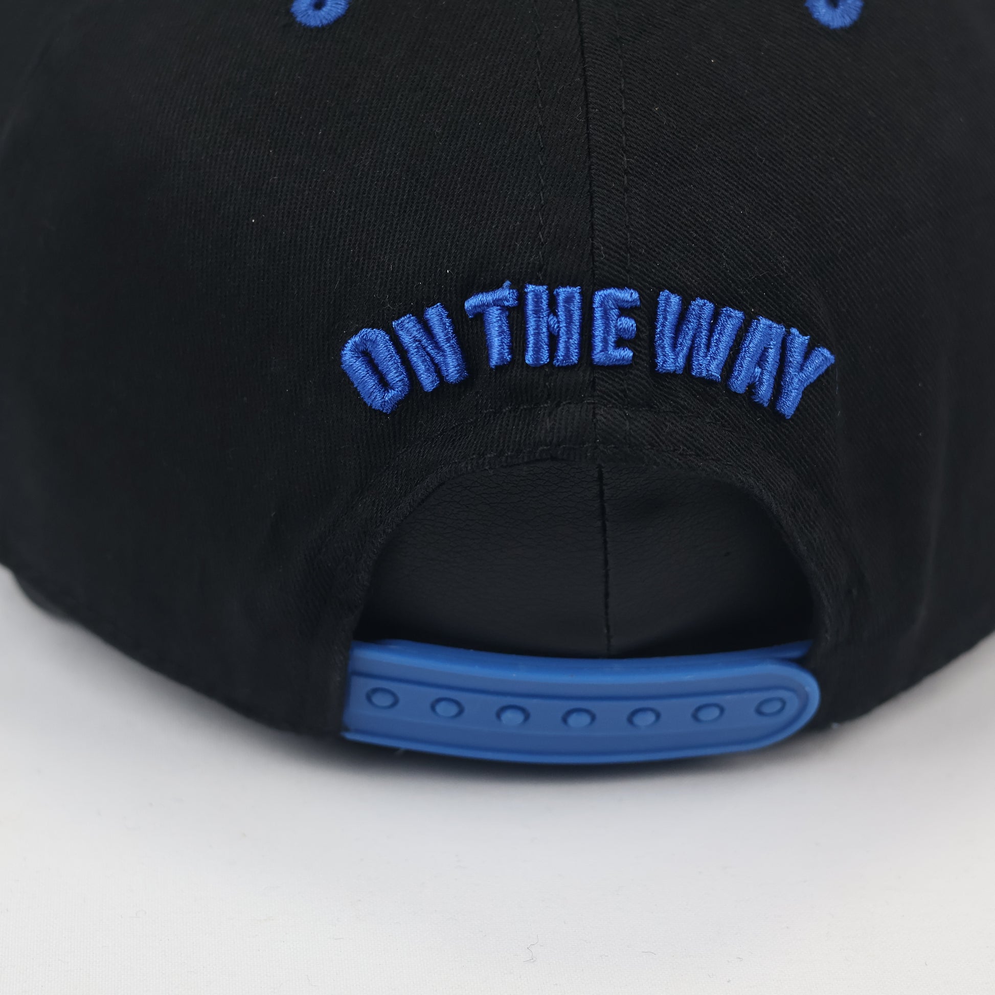 Rear Detail: "ON THE WAY" embroidered in blue above the closure