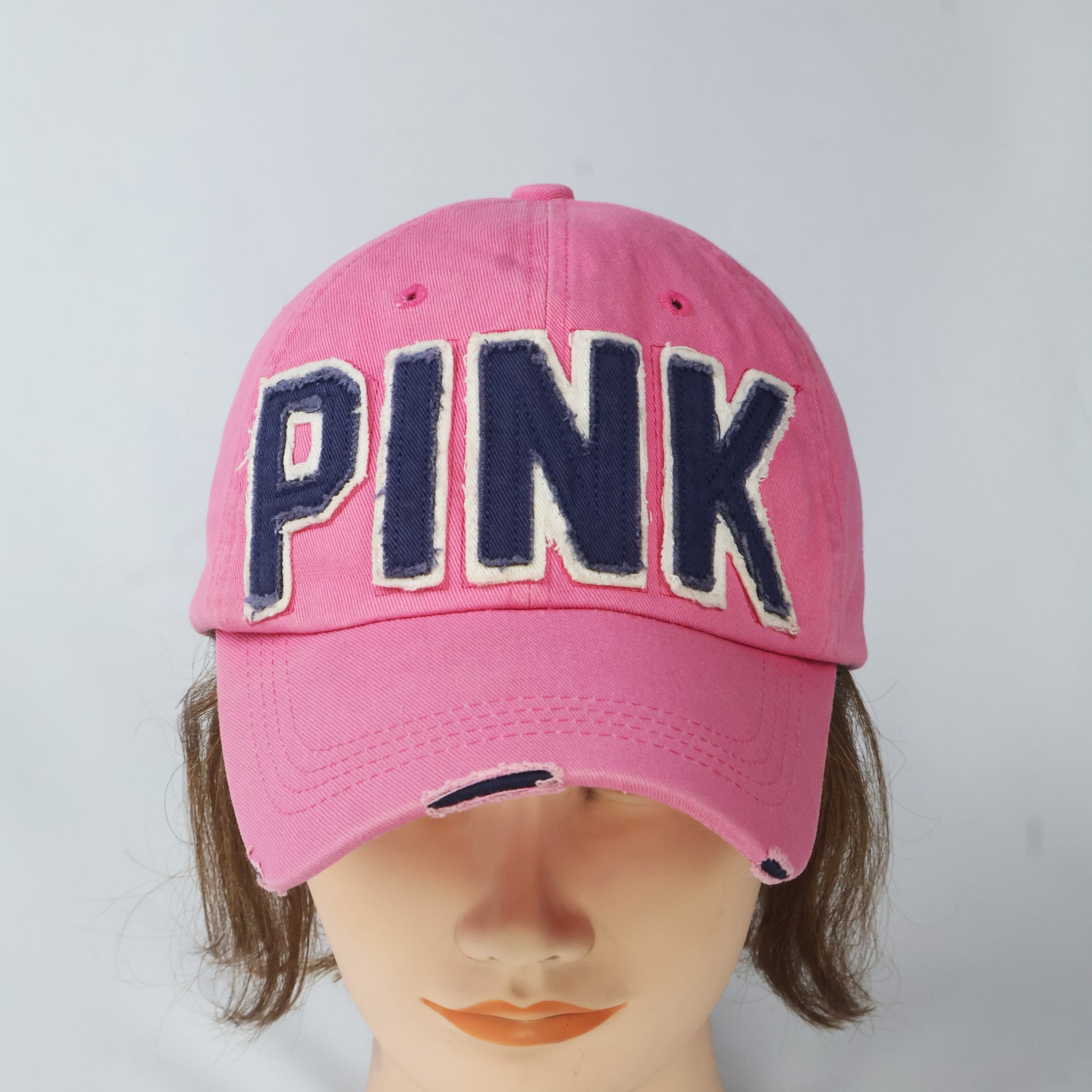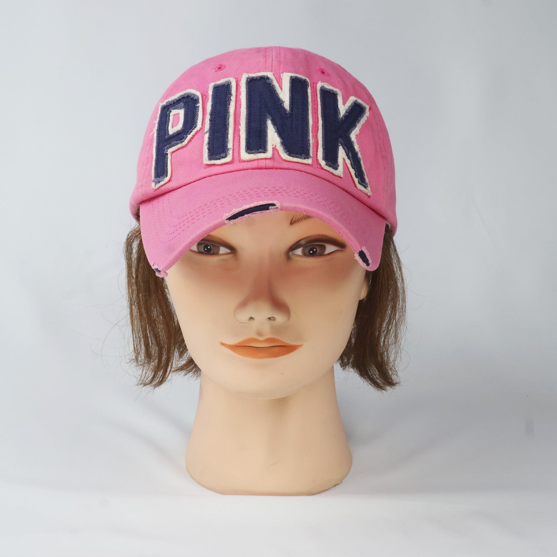 Main Graphic: Large "PINK" appliqué letters in navy blue with a frayed, raw-edge border.