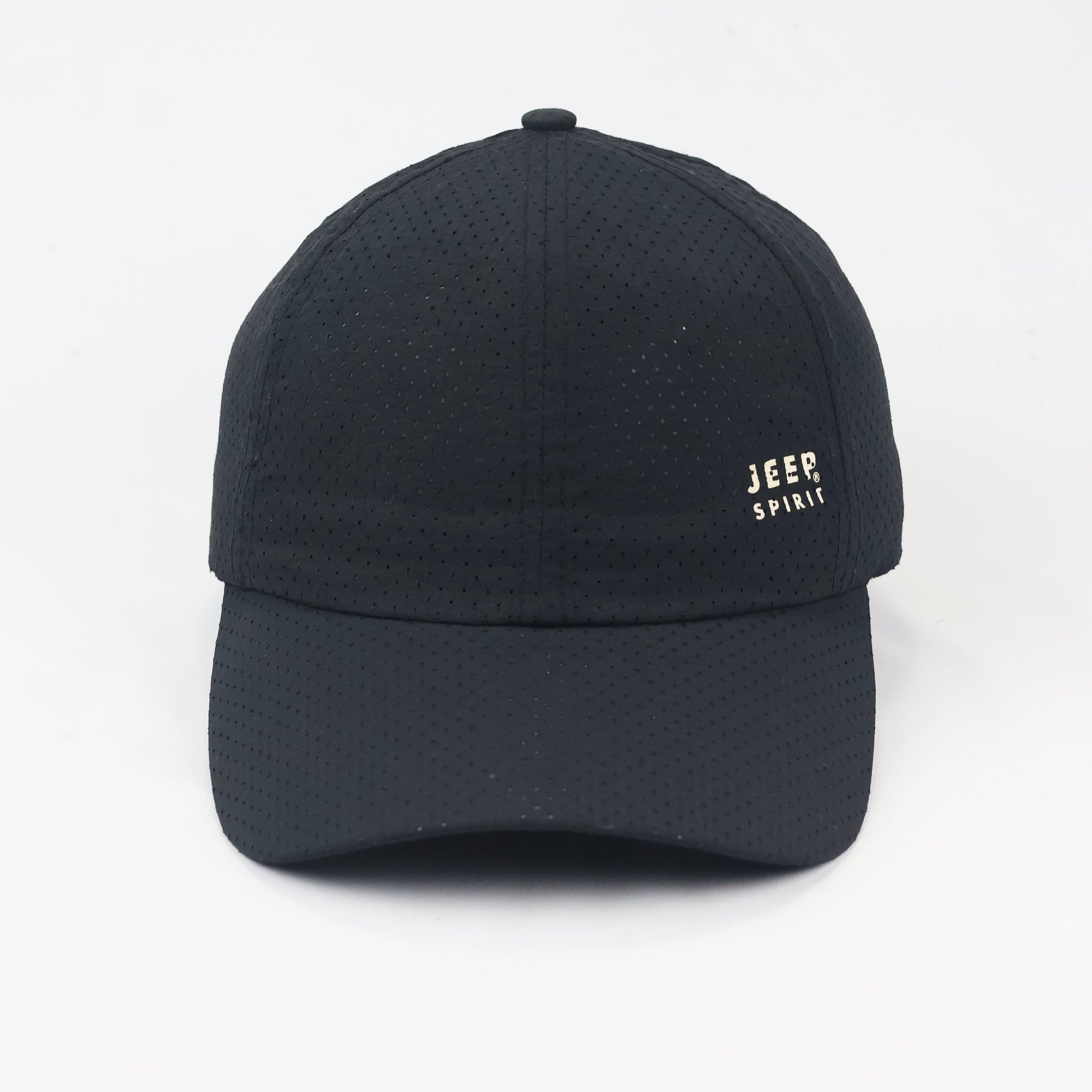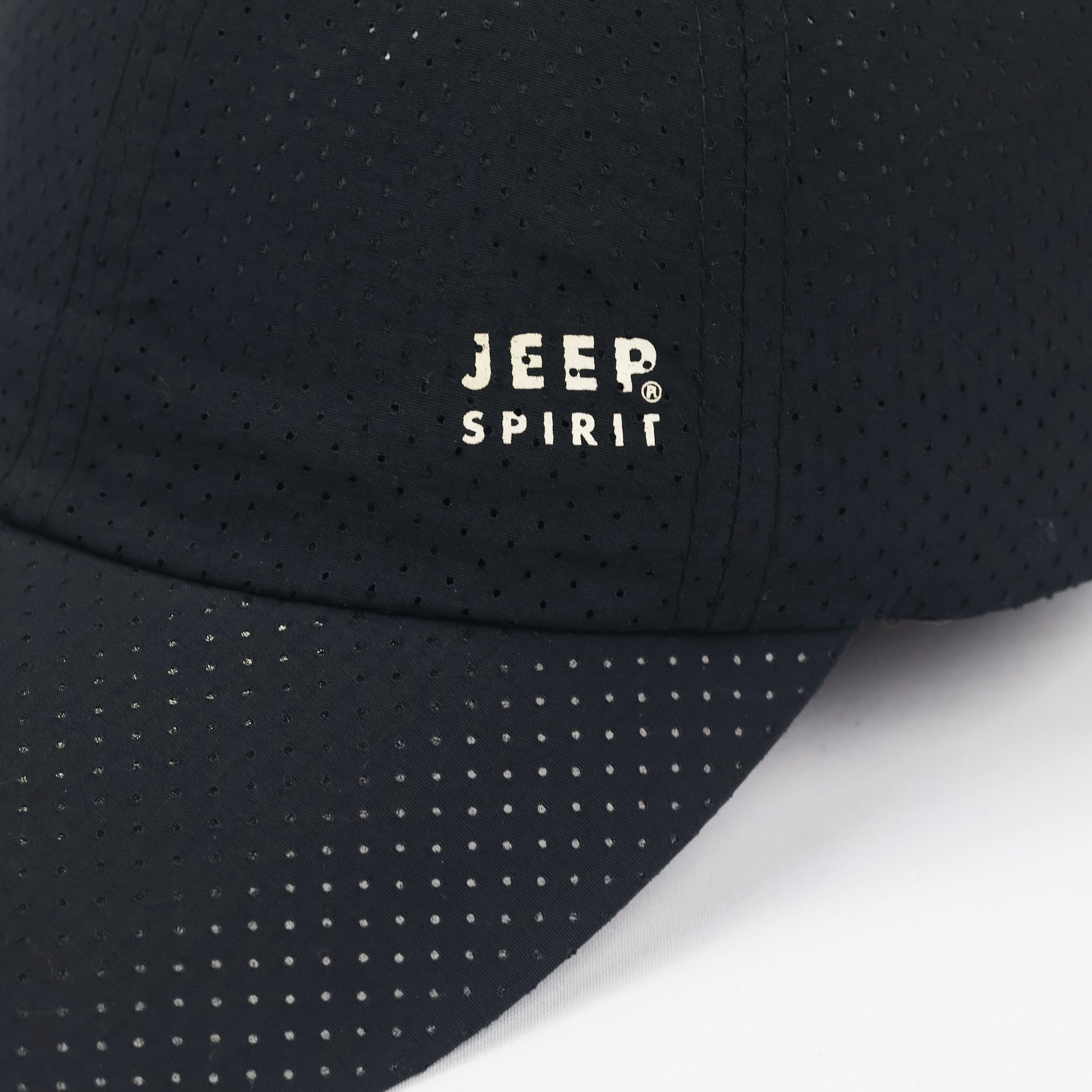 Design Details: Features premium laser-cut ventilation holes, a raised "Jeep Spirit" logo on the side, and branded internal seam taping
