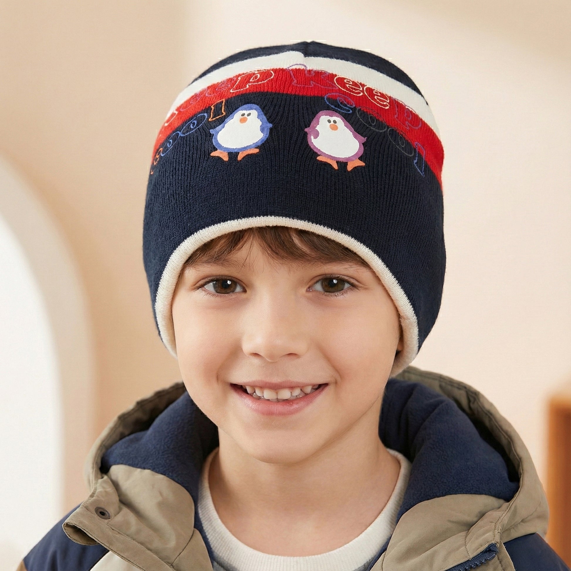 Kids Penguin Print Beanie | "Keep Cool" Graphic Winter Hat | Navy & Red Knit | Rs. 398.00
