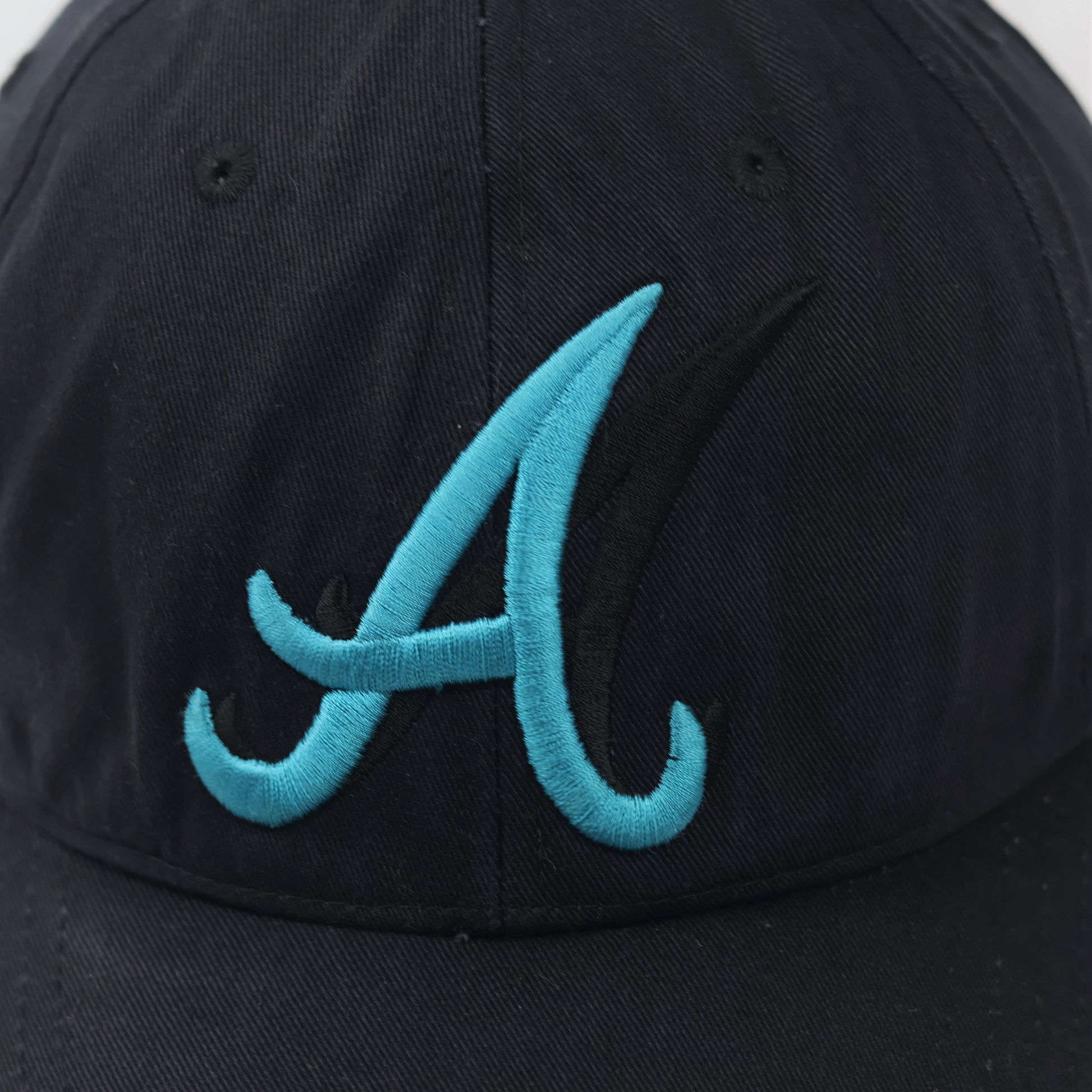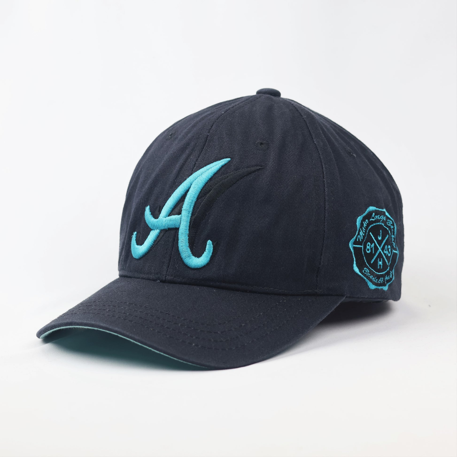 Design: Features a large teal embroidered "A" on the front and a circular shield logo on the side.
