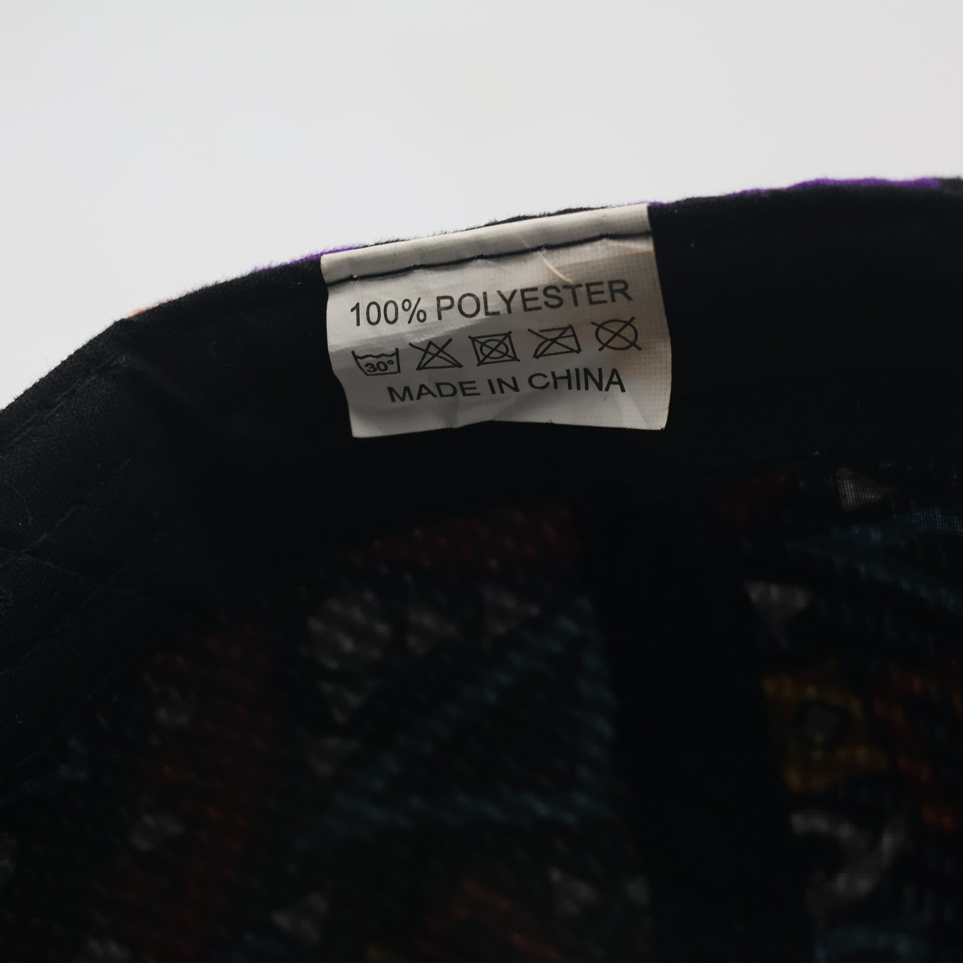 Color: Multi-color geometric pattern (Black, Yellow, Purple, Red, Blue) with White embroidery