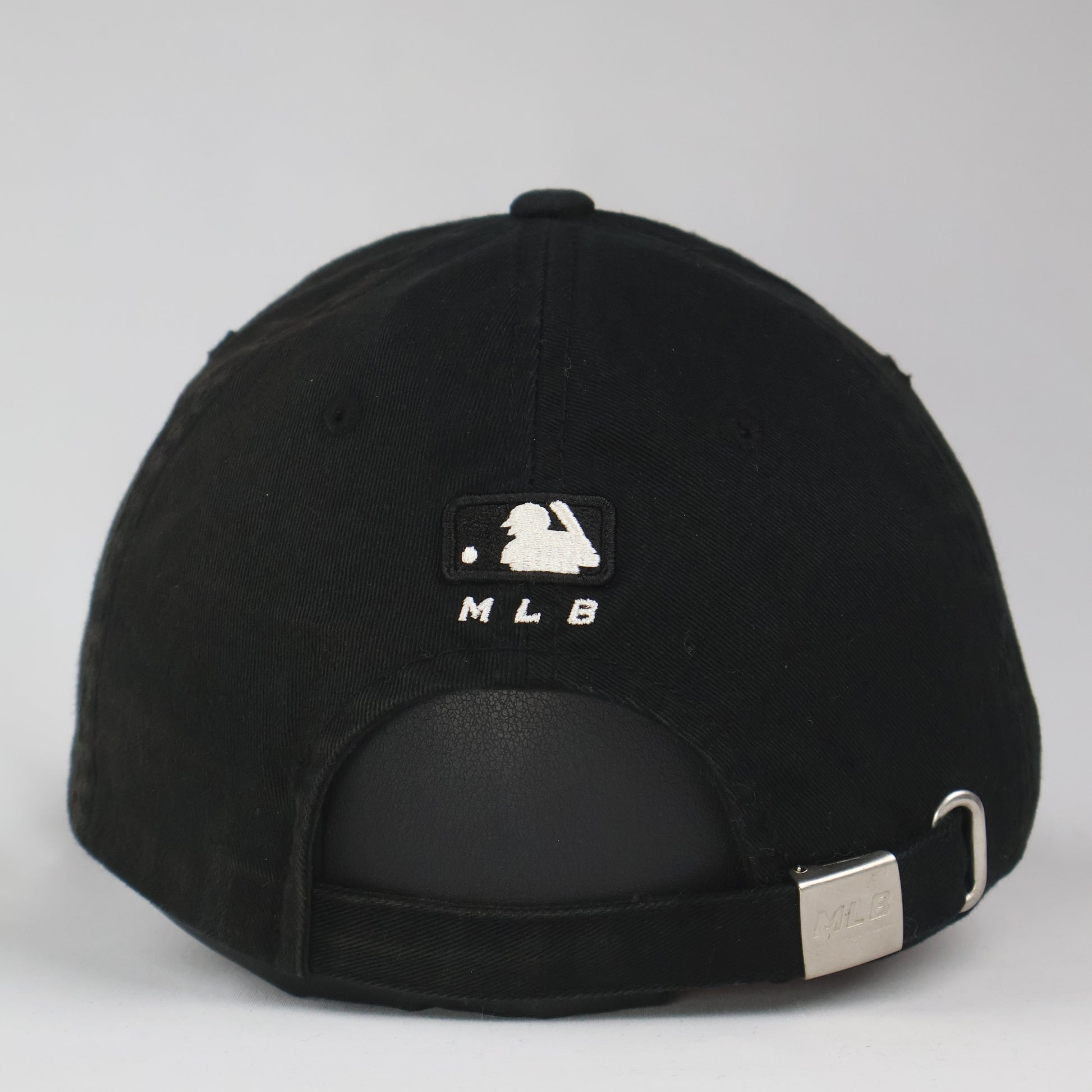 Closure: Adjustable strap with a branded "MLB" metal buckle.