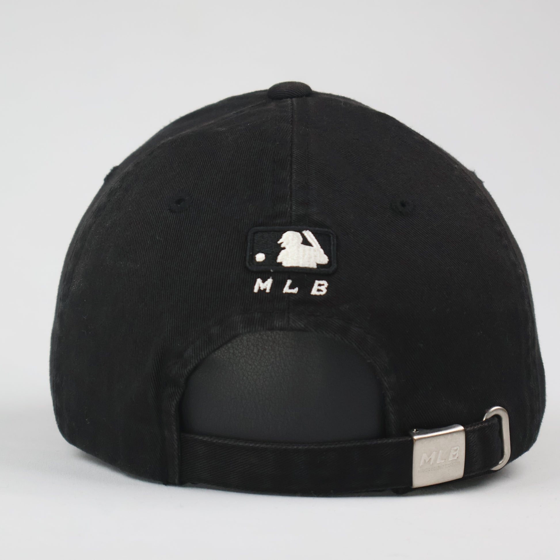 Closure: Adjustable strap with a branded "MLB" metal buckle.