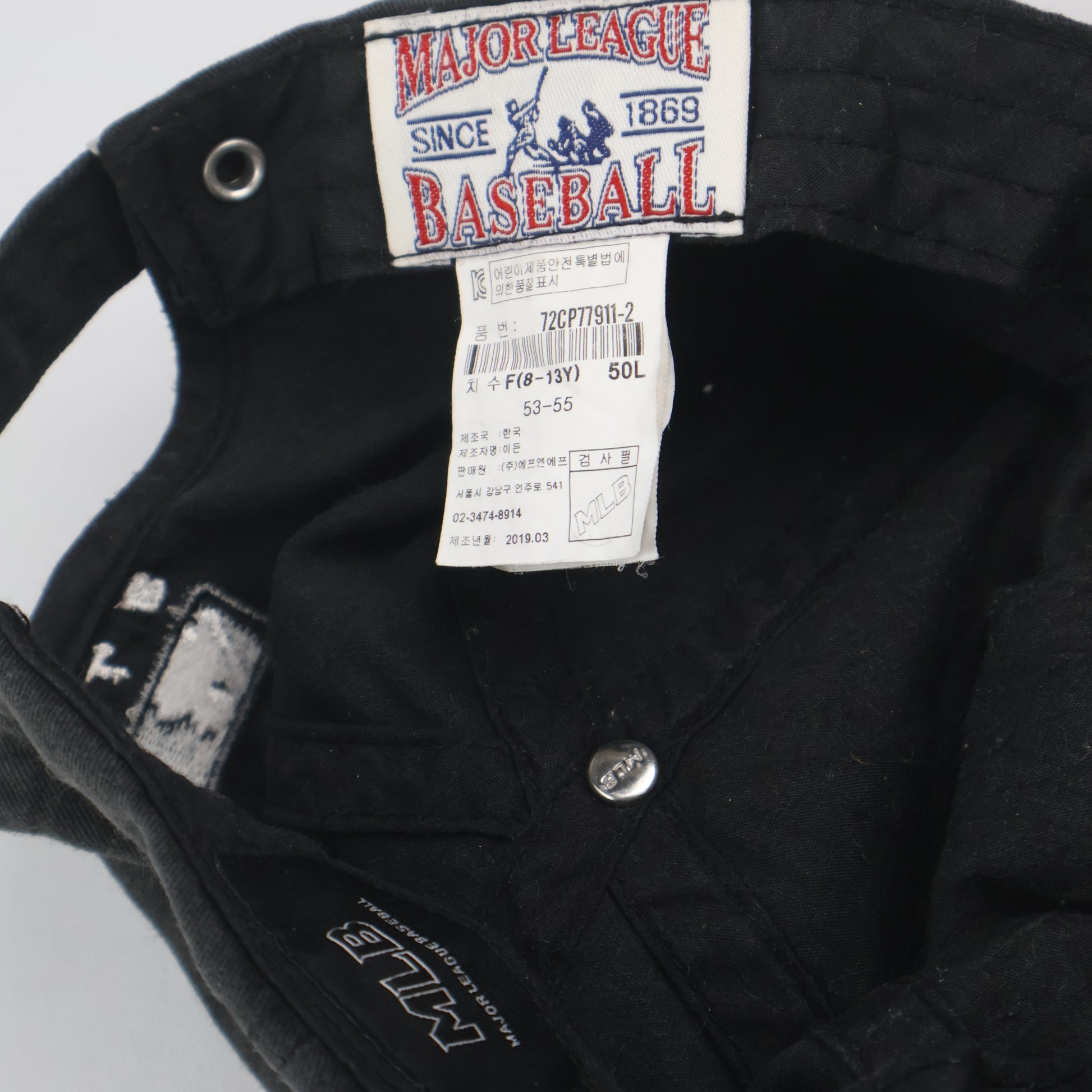 Closure: Adjustable strap with a branded "MLB" metal buckle.