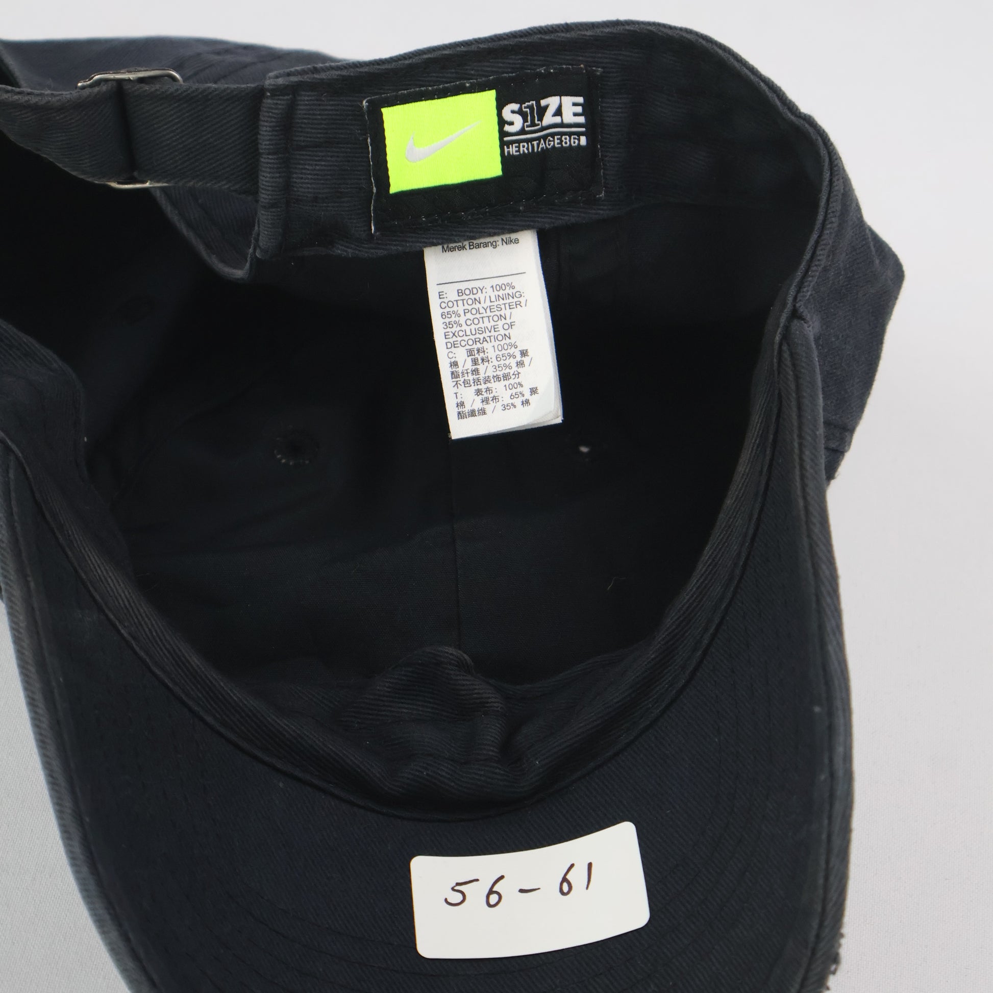 Size: One Size (Adjustable). Interior sticker lists size as 56-61cm.