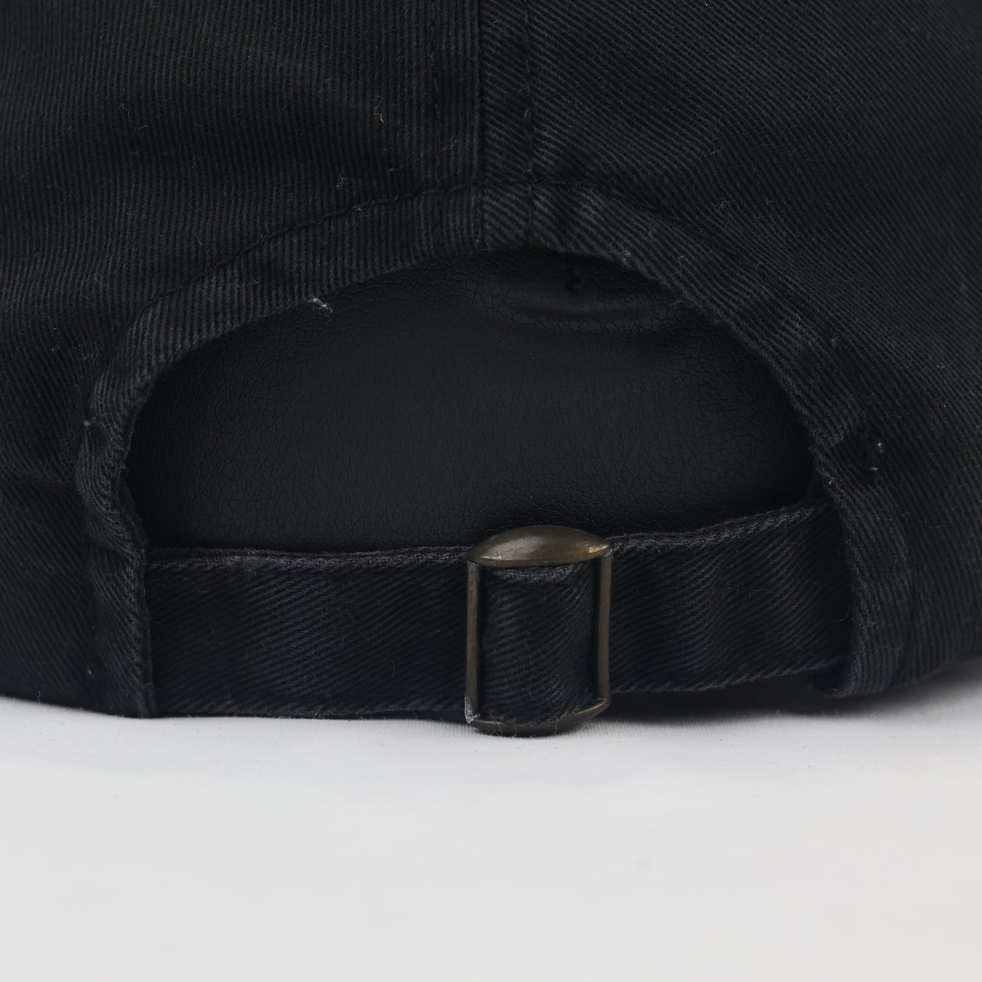 Closure: Adjustable fabric strap with a brass-tone metal buckle for a custom fit
