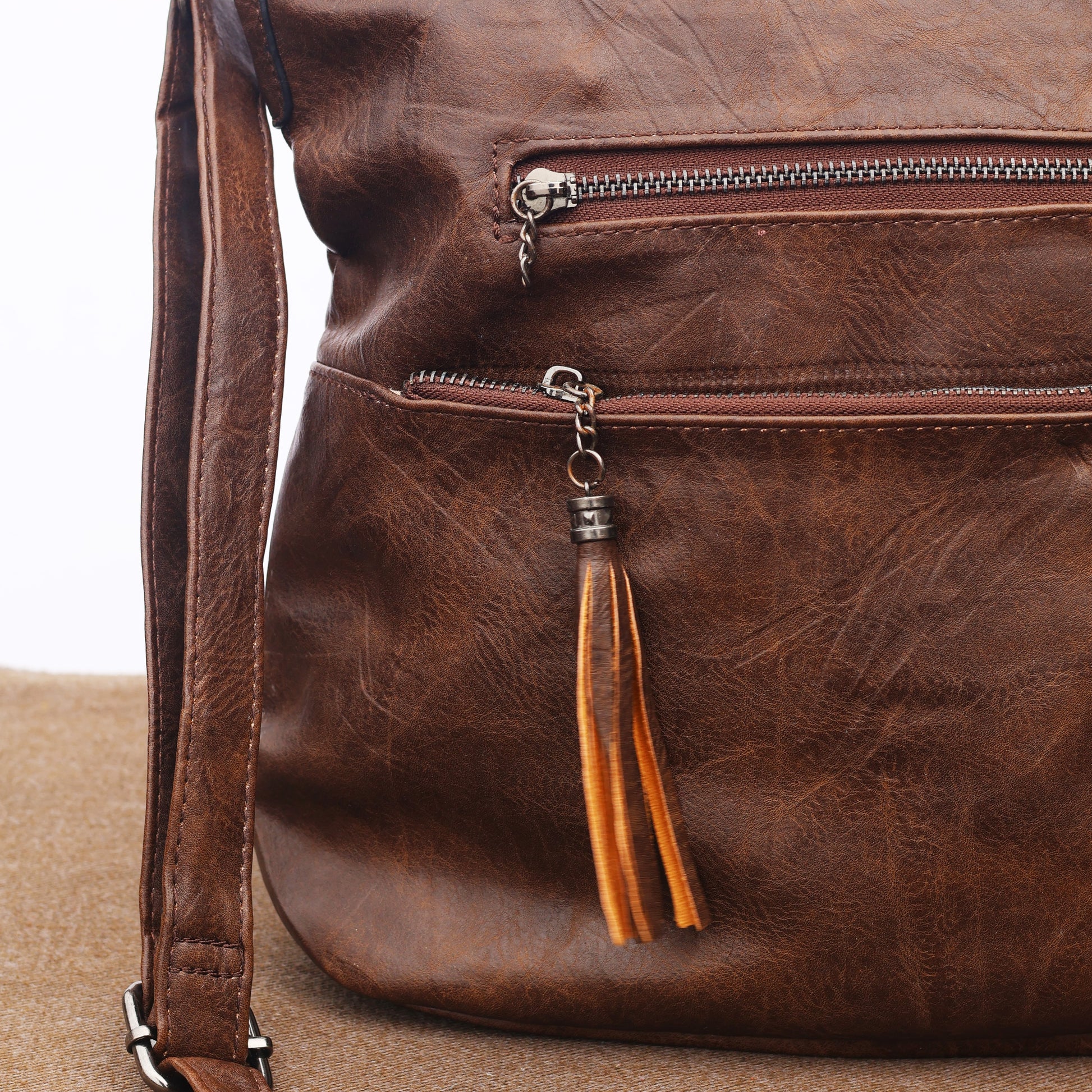 Interior: Fully lined in tan fabric with an internal zipper pocket and side pouches