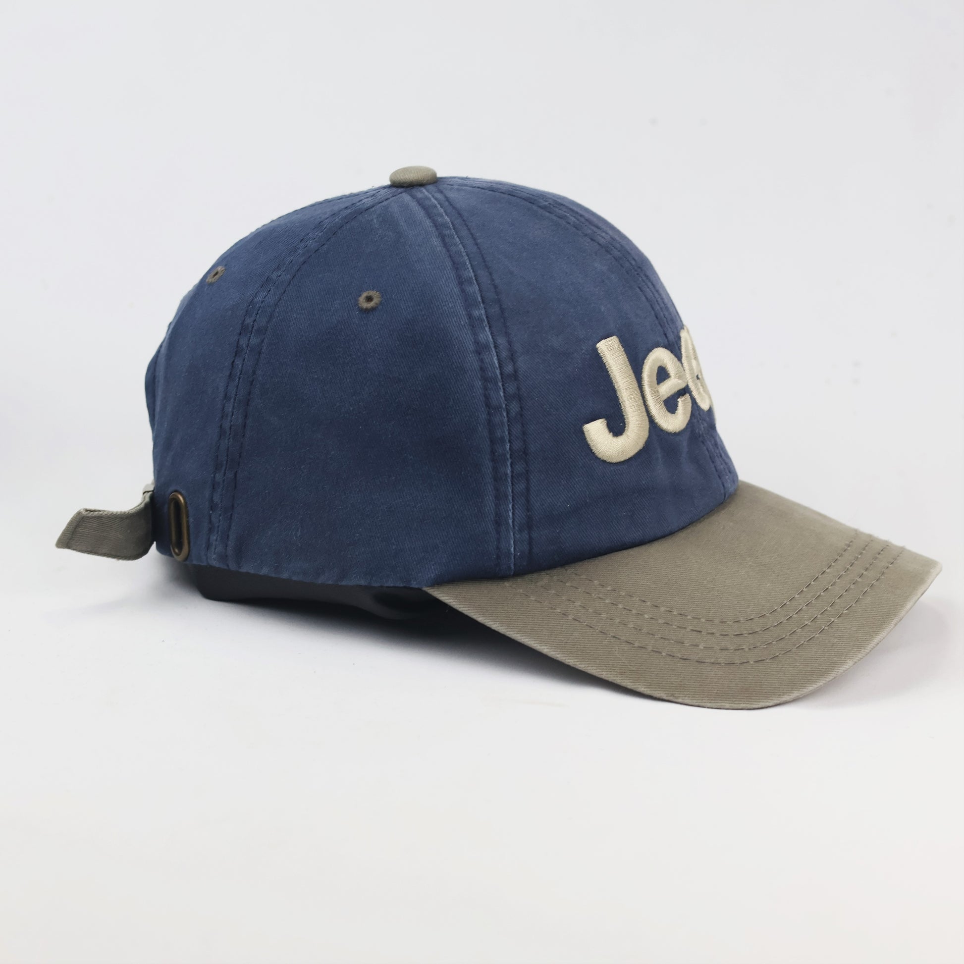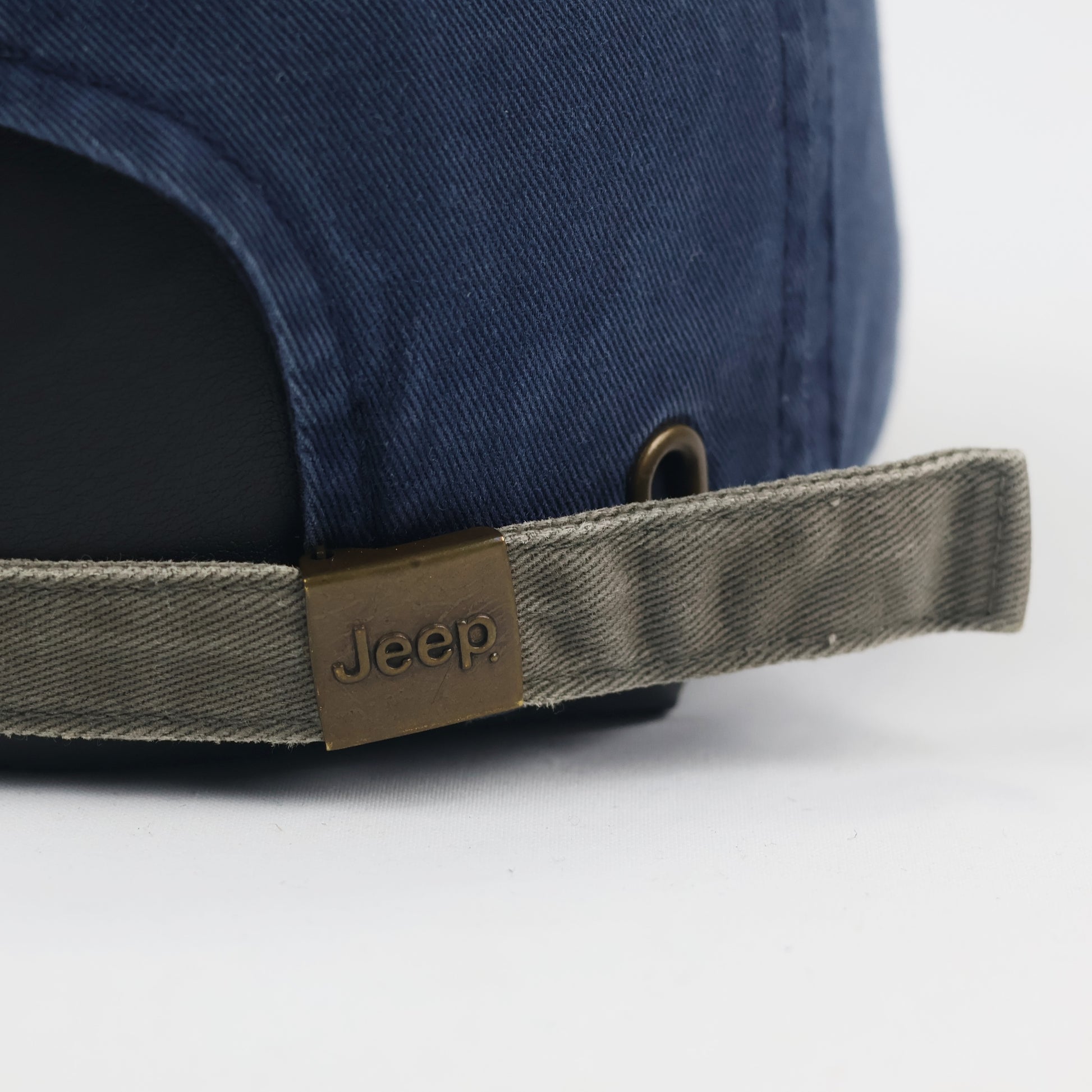 Closure: Adjustable fabric strap with a metallic Jeep-branded buckle