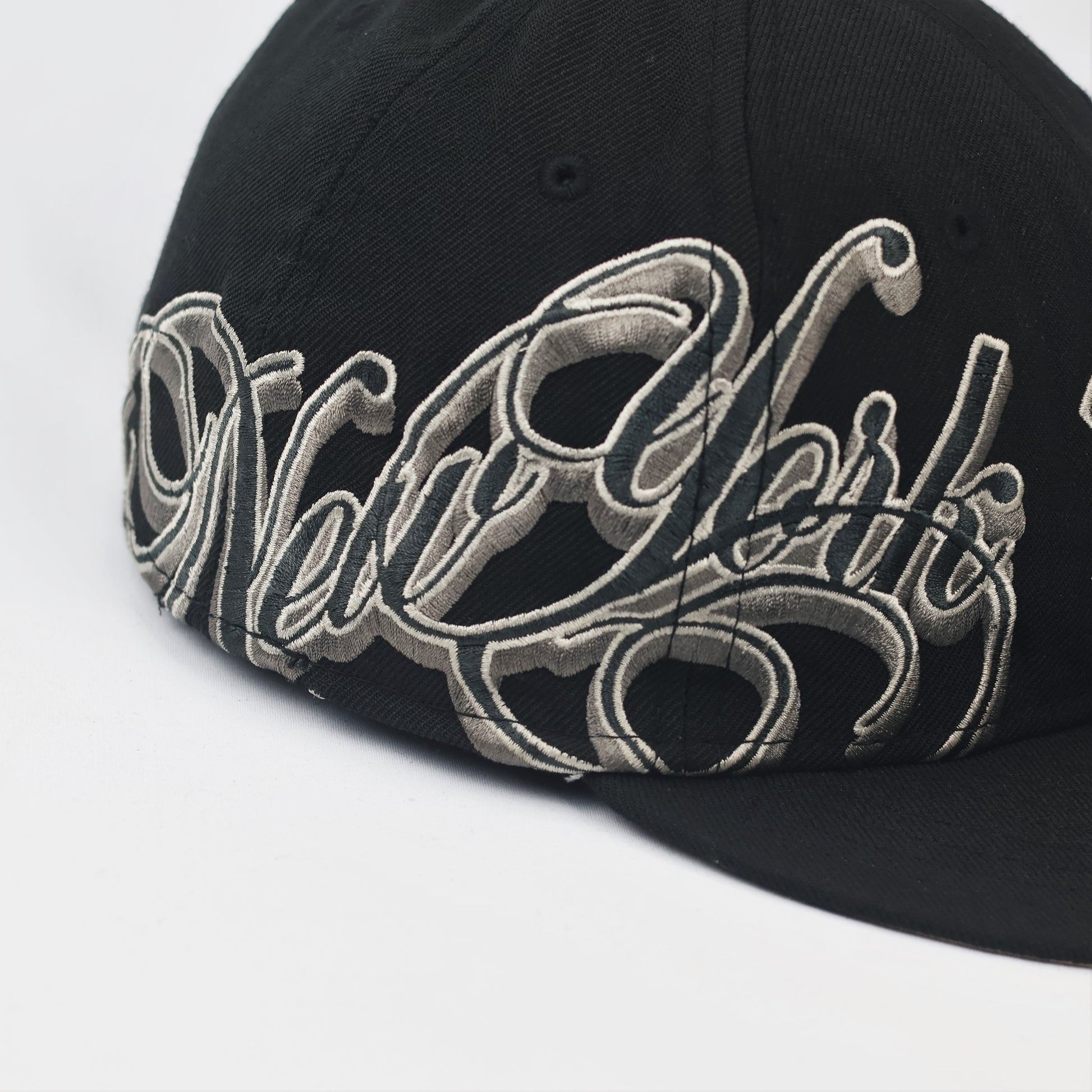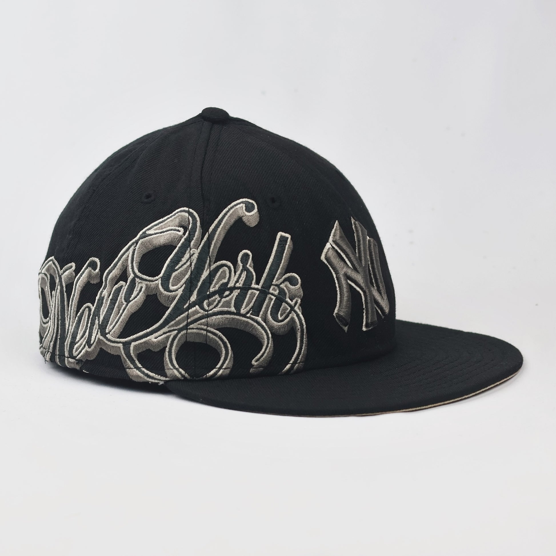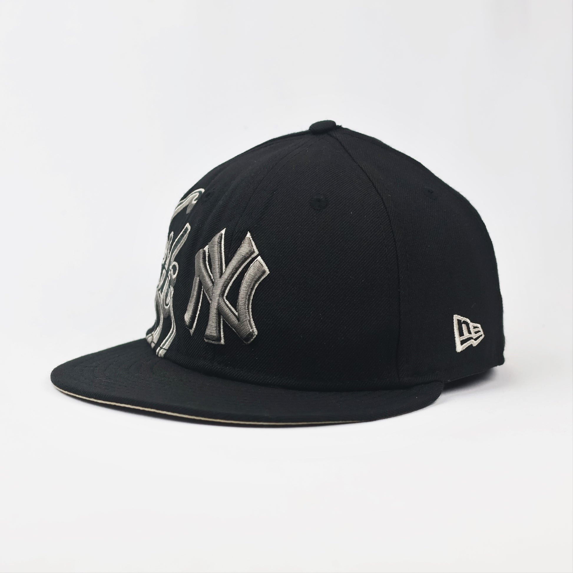 Vintage NY Yankees New Era Fitted Thrifted Hat | Black & Grey Script Logo | 59FIFTY