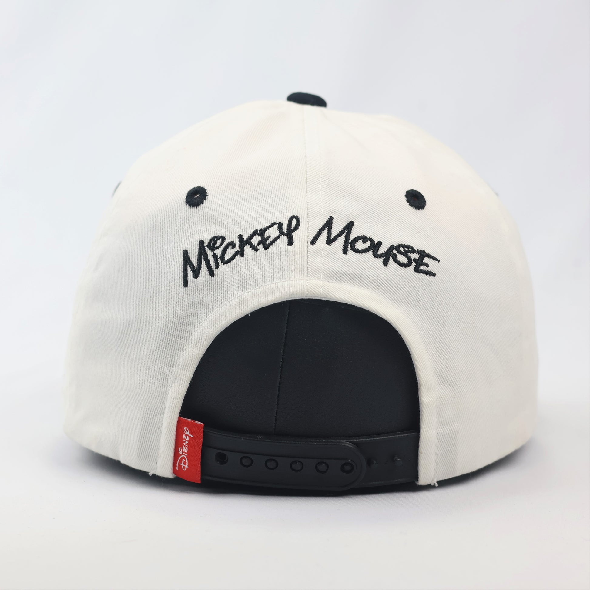 Design: Large embroidered Mickey silhouette on front; "Mickey Mouse" signature embroidery on the rear